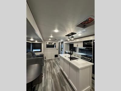 Perfect for your trips or weekend getaways, this travel trailer is the one! You will find a rear desk with an ottoman plus overhead storage if you plan to work while you're away from home. The dual opposing slides in the combined kitchen and living area will create an open floorplan, and the kitchen island will provide the chef of your group with more counter space. There is a tri-fold sofa and booth dinette that double as seating and sleeping space, and the full bath onboard will keep everyone clean. Don't overlook the front private bedroom with a queen bed and plenty of storage space for your belongings!